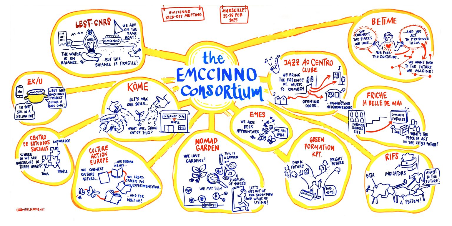 En février 2025, douze organisations de six États membres de l’UE se sont réunies pour acter le lancement d’EMCCINNO : cinq hubs créatifs et quatre partenaires de recherche. Du côté des sites pilotes : Be.time en Espagne, Jazz Ao Centro Clube au Portugal, Köme en Hongrie, ZK/U en Allemagne, Nomad Garden et la Friche la Belle de Mai en France vont concevoir et tester des prototypes basés sur leurs besoins en matière de transition écologique. Du côté de la recherche, du soutien théorique et méthodologique, l’apport et l’observation de chercheur·euses : le CNRS et l’Université Aix-Marseille / laboratoire du LEST en France, le Centro de Estudos Sociais au Portugal, Rifs en Allemagne, Greenformation Kft. en Hongrie et Culture Action Europe en Belgique.